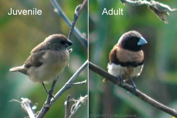Rarotonga: two fieldspecimens, 2006/10, Charleen Nelio Heather, behind Lagoon Lodges, Aroa, with ID as Chestnut-breasted Mannikin; 11 specimens 2001 imported by Anna Nelio assisted by daughter Charleen Nelio, with NZDoC ID as Lonchura spp., were later given to Ata Herman. Mangaia: ~4 adults and ~4 juveniles fieldspecimens+photo, 2006/5, Vaitate swamp, G.McCormack, ID G.McCormack and I.Karika as Lonchura castaneothorax, G.McCormack (CINews 13/5/2006) had suggested this identification based on a description by Peter Ngatokorua who also reported that a road gang had first seen the birds in 1999 near Tavaenga swamp.
