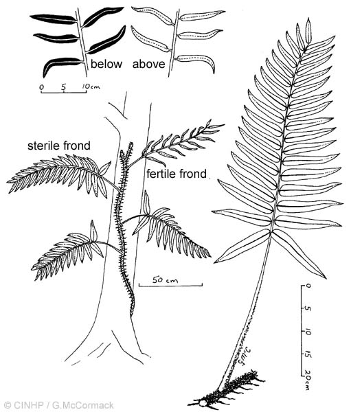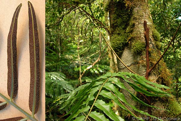 IDENTIFICATION: Ground and low-climbing epiphytic fern, with fronds to 1m. ROOT thick and hairy, with well-spaced fronds. Low-climbing to 3m, with fertile fronds uppermost. FROND non-fertile: stalk, to 40cm, with brown hairs, especially at the base; leaves ladderlike, opposite to sub-opposite; LEAVES lancelike, to 20x4cm, leathery, base round and asymmetrical, tip sharp, stalk short to 2mm. FROND fertile: smaller; leaves smaller, to 12x1cm, fleshy and brittle; spores cover underside except for midrib.