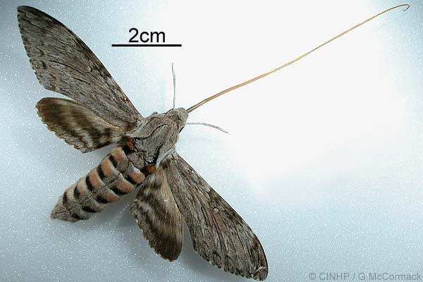 GENERAL NOTE: Mainly active from dusk to midnight, hovering over flowers to suck their nectar with the long proboscis (to 13cm). Sometimes attracted to lights.