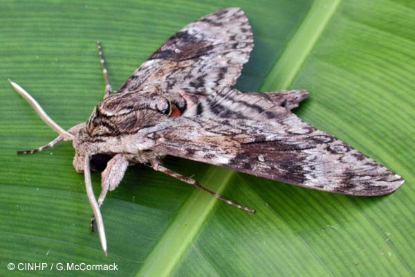 IDENTIFICATION: Large moth (5cmTL, 10cm Wingspan) - female larger than male. Wings fold roof-like over body. Forewings light to dark grey, w/wo dark patches and markings; subterminal grey-brown wavy line; terminal irregular toothed whitish line. Hind wings grey with 3 blackish bands. Thorax grey, silvery underneath. Abdomen grey above, lighter beneath; pink, black and whitish markings along sides. Legs cream. Head grey, eyes large, proboscis (=haustellum) can reach 10cm. Antennae slender, cream. CATERPILLAR to 10cm TL feeds on Morning-glory plants (CONVOLVULACEAE), have the hawkmoth a long horn posteriorly - called hornwroms. Body brownish to olive-green with a slanting pale stripe on the side of each segment. PUPA to 6cm with anterio-ventral "jug-handle" (containing the adult haustellum or "tongue").