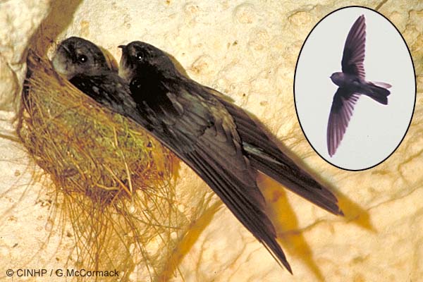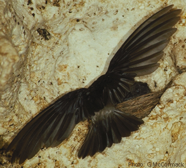 GENERAL NOTE: Atiu Swiftlets nest and roost in completely dark parts of caves. During the non-breeding season they typically leave in the morning between 6-7.30am and return in the evening between 6-7pm. During the breeding season they return about 6 times to feed their young. Outside the cave they never land. They use their excellent vision to catch flying insects over open areas and near trees. In the caves the birds echolocate using a series of audible clicks, which increase in frequency as they approach objects. The clicks have a single pulse of 2-3milliseconds duration. When they land the call clicks are lengthened and this may act as a warning announcement. Takitaki is an imitation of the sound of the swiftlet; and 'ana" means 'cave'.