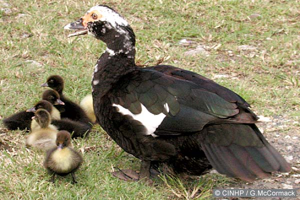 The wild Muscovy Duck is a perching duck spending much time in trees in dense forests near ponds and streams. They feed mainly on aquatic plants. They are dark brown with a bright green-purple gloss, and white patches on the wings. The male is distinuished by elongate feathers forming a small crest on the head and by having small red wattles.