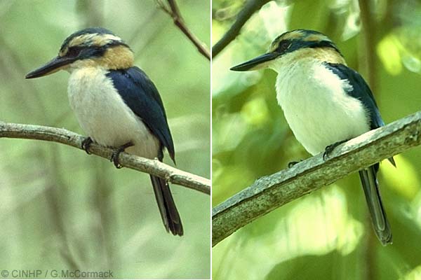 IDENTIFICATION: A small bird to 22cm. Bill long stout and black; legs short and dark grey; tail narrow and dark blue. Body blue to blue-green above interrupted by a wide dull yellowish-orange collar and a narrow dull yellowish-orange head-band above the eye leaving a large blue-green cap; white below. Legs dark. VOICE: a characteristic two-note "tanga-eeeoo", repeated 3-5 times in succession, a pair sometimes call alternately. Also represented as "ki-wow".