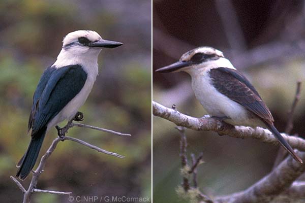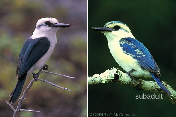 IDENTIFICATION: A small bird to 22cmTL. Bill long stout and black; legs short and dark grey; tail narrow and short. Head white with a small blue-green cap; eyestripe around back of head blue-green; neck white to pale yellow; underside white. Back, wings and tail blue. YOUNG with extensive blue cap and eye-band, and white-fringed wing feathers. VOICE: noisy chattering "ke-ke-ke" or a repeated "ki-kiu".