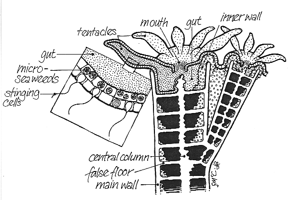 The tentacles of each coral animal or polyp have stinging-cells to capture minute plants and animals that touch them. Unfortunately the polyps usually fail to catch enough food and would die if they were not good gardeners also. In their jelly-like skin they have lots of yellow-brown micro-seaweeds or micro-algae. These micro-seaweeds take in sunlight to make sugars and other foods for themselves, and they share their food with the coral animal. Scientists rarely miss an opportunity for a big word, so they called these micro-seaweeds, zooxanthellae – literally “little yellow animal-lovers”.