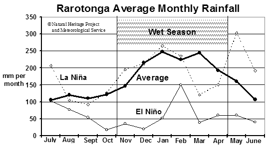 El Niño events affect climate in different places in different ways. For example, in the Northern Group it means more rain than usual, while in the Southern Group it means less rain. The bold line on the “Rarotonga Average Monthly Rainfall” graph shows the long-term average-monthly rainfall for Nikao, plotted from mid-year to mid-year. It shows that from July to October the rainfall is around 110mm-per-month. Our “official” Wet Season starts in November, and this corresponds with a slight rise to 150mm average. Throughout the rest of the Wet Season, December to April, the average is 200-250mm-a-month. May is usually wetter than November, and by June the average is around 110mm again.
