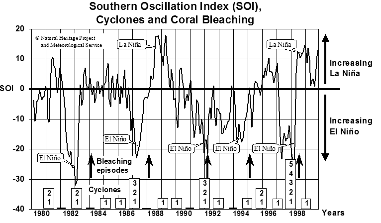 The graph shows the main bleaching events for the Society Islands, and the situation is probably very similar for the Southern Cook Islands. The bleaching episodes are shown as upward pointing arrows, and it can be seen that the five main bleaching episodes follow the five main El Niño events .