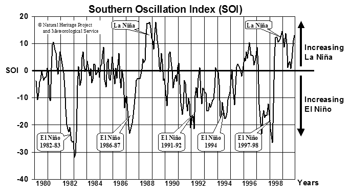 For many years scientists had known that the atmospheric pressure over the eastern South Pacific was usually greater than over Indonesia and northern Australia – usually measured at Tahiti and Darwin. At irregular intervals this pressure difference weakened and, sometimes, reversed. This oscillation of air pressure each side of the South Pacific was known as the Southern Oscillation (SO). The measurement of this pressure difference is known as the Southern Oscillation Index (SOI), and the turbulent line on the “Southern Oscillation Index” graph is the SOI from 1980 to 2000.