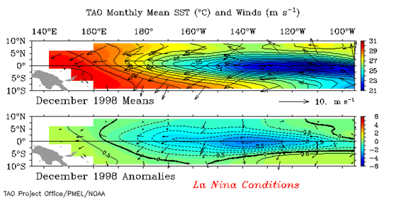 Sometimes, when the Southern Oscillation Index is very negative, the Tradewinds fail to re-establish, and may even reverse for days at a time. Under these conditions the pile of hot water continues to flow eastward right across the Pacific to Peru. This is the El Niño current the Peruvian fishermen had noticed arriving around Christmas. The “El Niño” illustration shows the effects of very week Tradewinds.