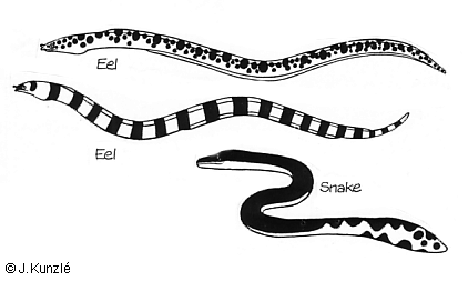 Snake-eels differ externally from sea-snakes in having a dorsal fin along most of the body, a more-or-less pointed tail, and protruding nostrils on the upper lip. Although they are not poisonous, they do have lots of small sharp teeth.