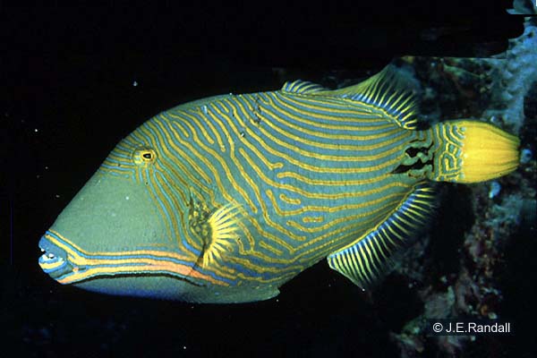 COMMON NAMES: Orangestriped Triggerfish, Orange-lined Triggerfish, Undulate Triggerfish, Red-lined Triggerfish; German Orangestreifen-Drückerfisch; French Baliste Strié, Baliste Vent, Baliste Ondule