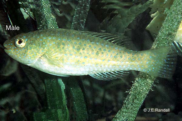 KEY FEATURES: To 30cm SL, a unique parrotfish not undergoing a sex-reversal. Slender, depth 3.5x in SL; tail round; teeth partially fused into rows of dental plates. ADULTS mottled olive to brown, paler underside; fins mottled yellowish. FEMALE w/wo blue spots upperhalf. MALE with blue spots on body, head and fins; and a pale midside stripe.