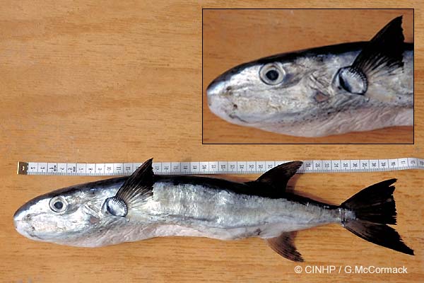 KEY FEATURES: A round elongate fish, to 50cm SL. Smooth skin, with small extendable spines on the belly. Dark blue-grey above, silver sides and white underside. Fins soft and dark grey. Round fleshy mouth with beak-like teeth.